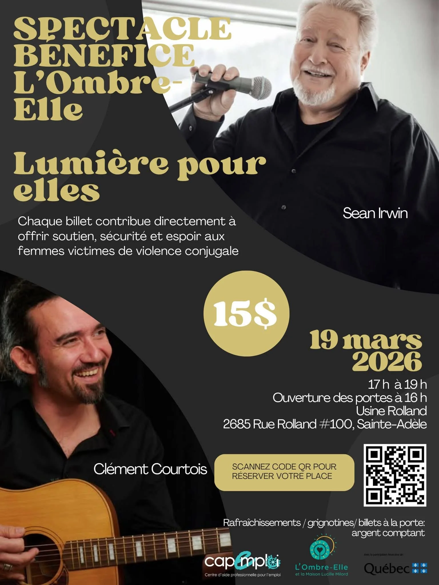Portée par des bénévoles engagés dans un parcours de réintégration au marché du travail (Cap Emploi), cette soirée-bénéfice vise à soutenir les femmes victimes de violence conjugale dans les Laurentides. Tous les profits seront remis à L’Ombre-Elle, un organisme de la région qui offre hébergement, accompagnement et services spécialisés aux femmes, avec ou sans enfants.